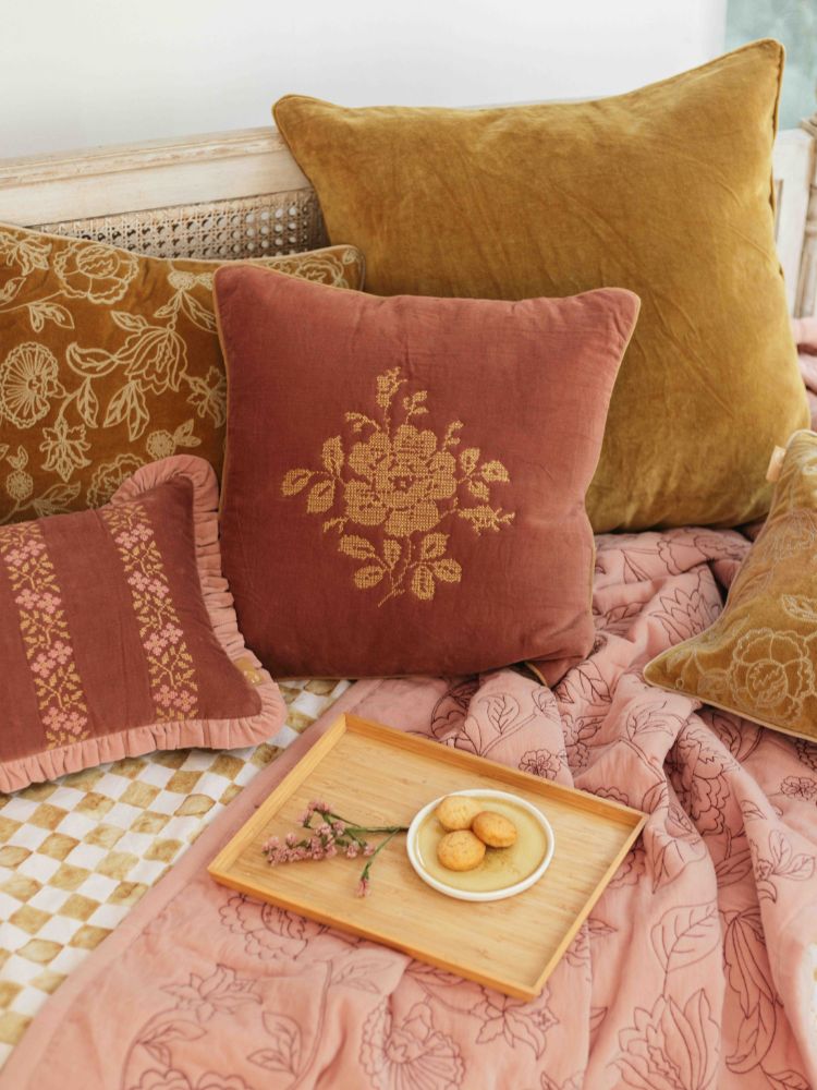Twig Oatmeal Embroidered Velvet Cushion Cover