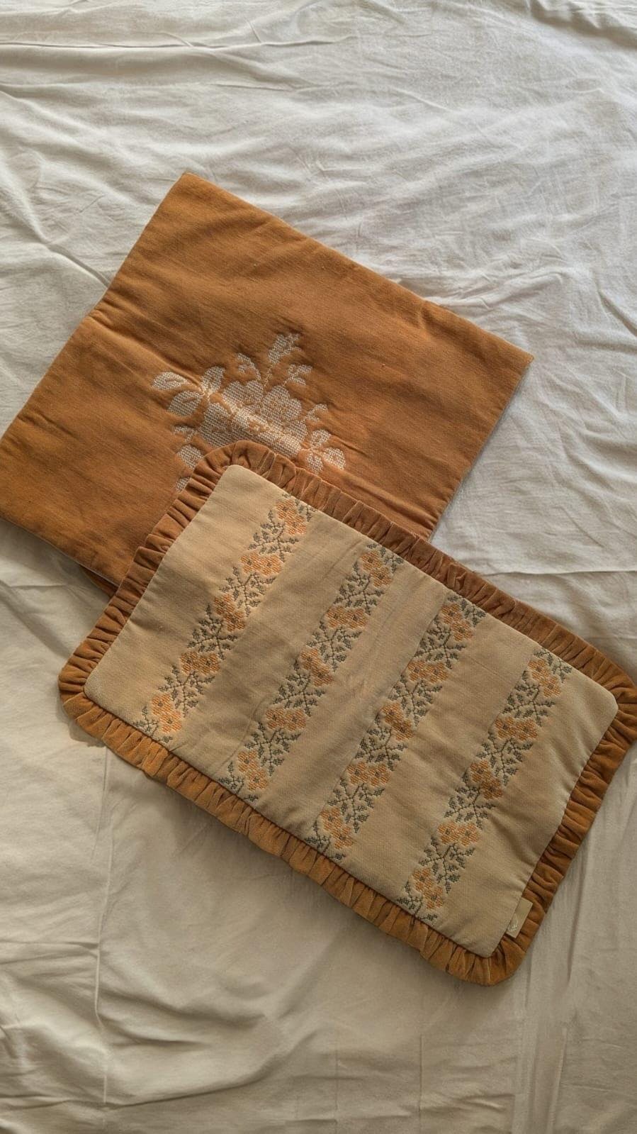 Our Camellia Cross Stitch Cushion Cover is crafted from soft cotton microvelvet and detailed with floral cross-stitch embroidery at the centre inspired by the Camellia flower. The embroidery is lightly padded with polyfill, creating a gentle raised effect that adds dimension and quiet texture.