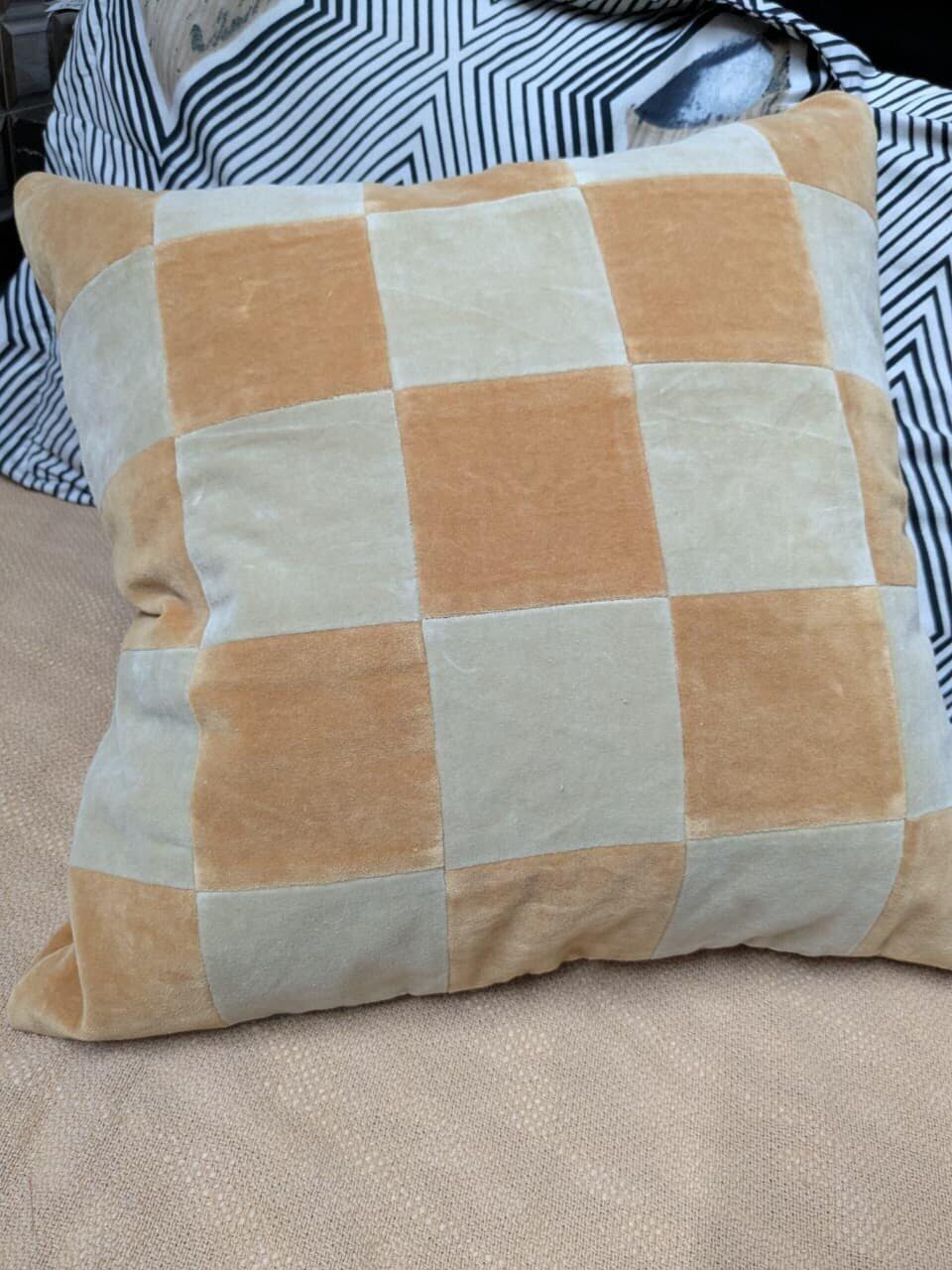 Our Fig Melon Checker Patch Velvet Cushion Cover features a beautiful patchwork design crafted by stitching together small squares of premium 100% cotton velvet fabric. This checkerboard pattern adds rich texture and a plush feel to your living space.