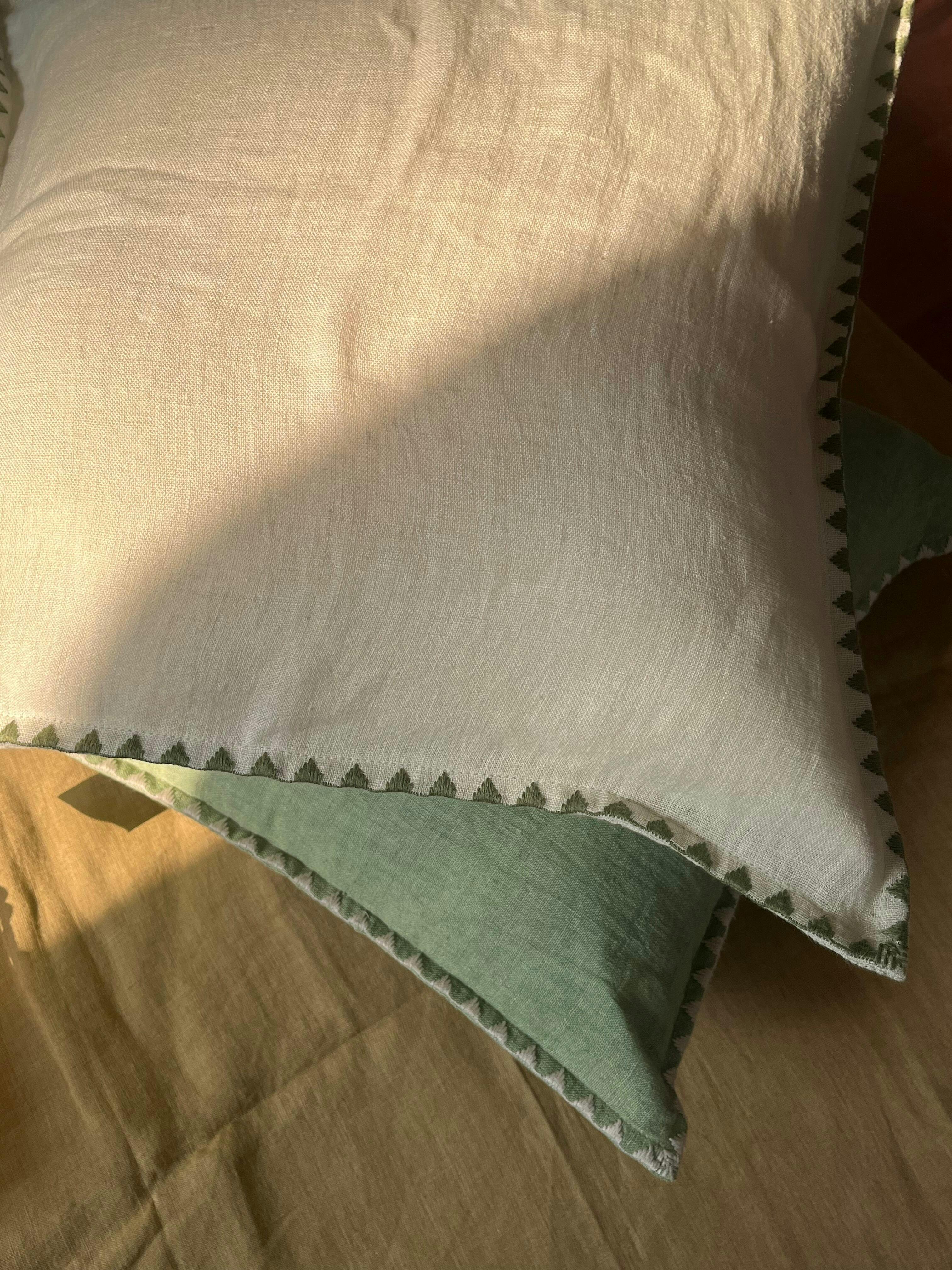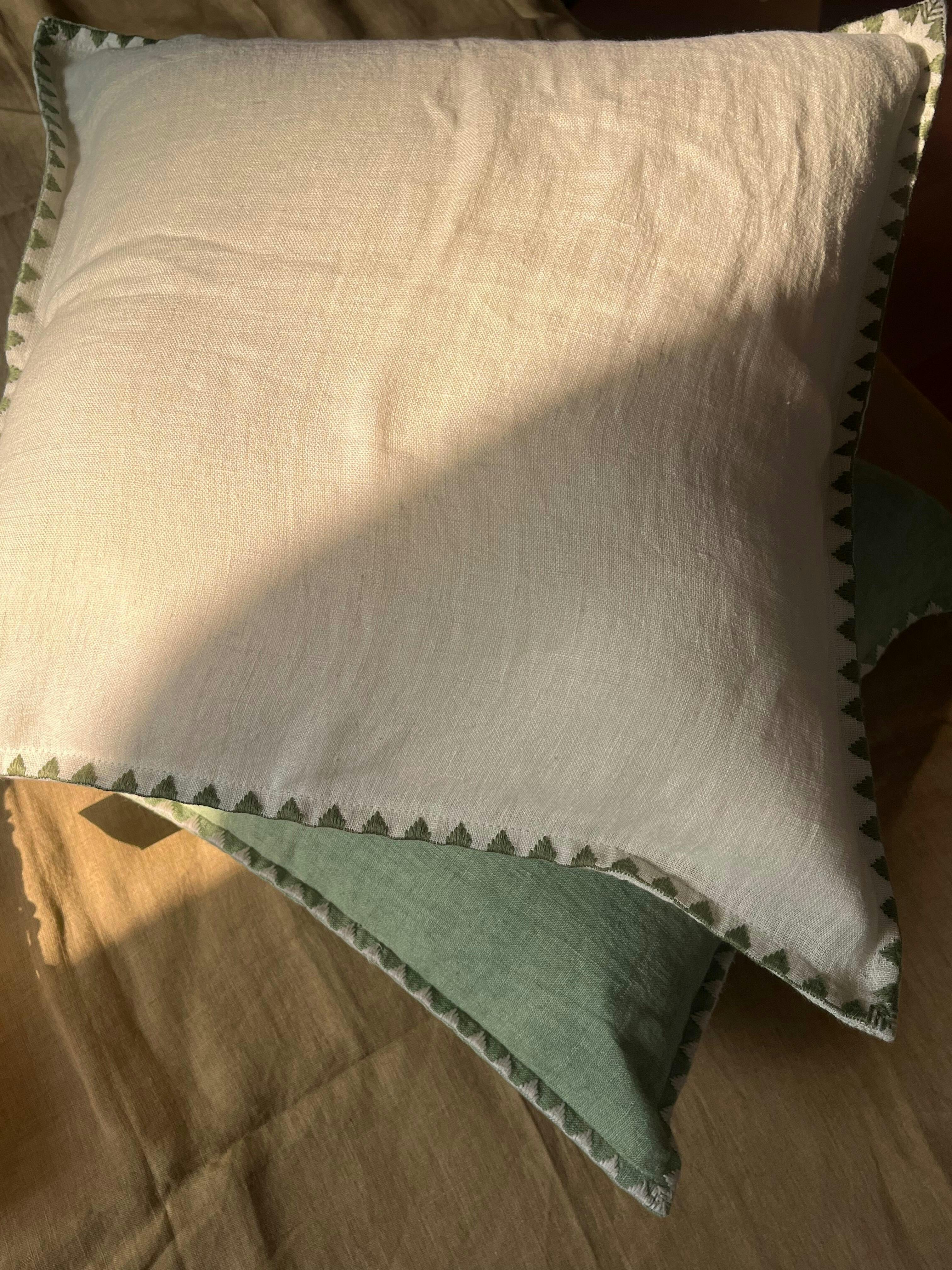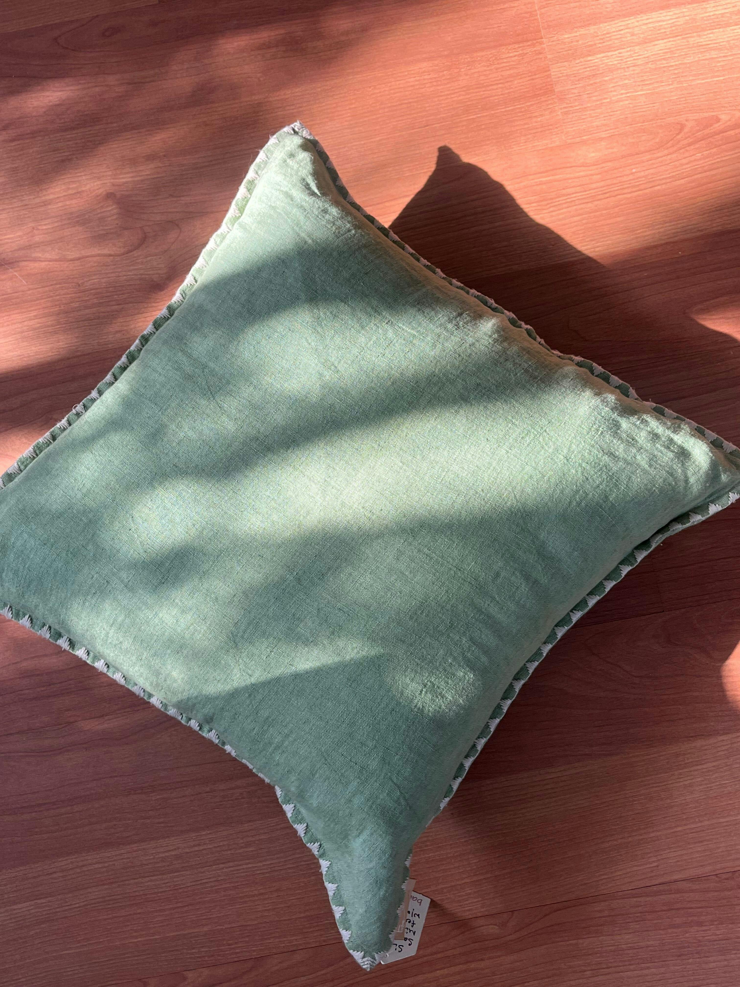 Our Temple Pistachio Cushion Cover is made from fine linen in a simple flat weave with intricate embroidery at the borders, an ideal complement to add to any setting.