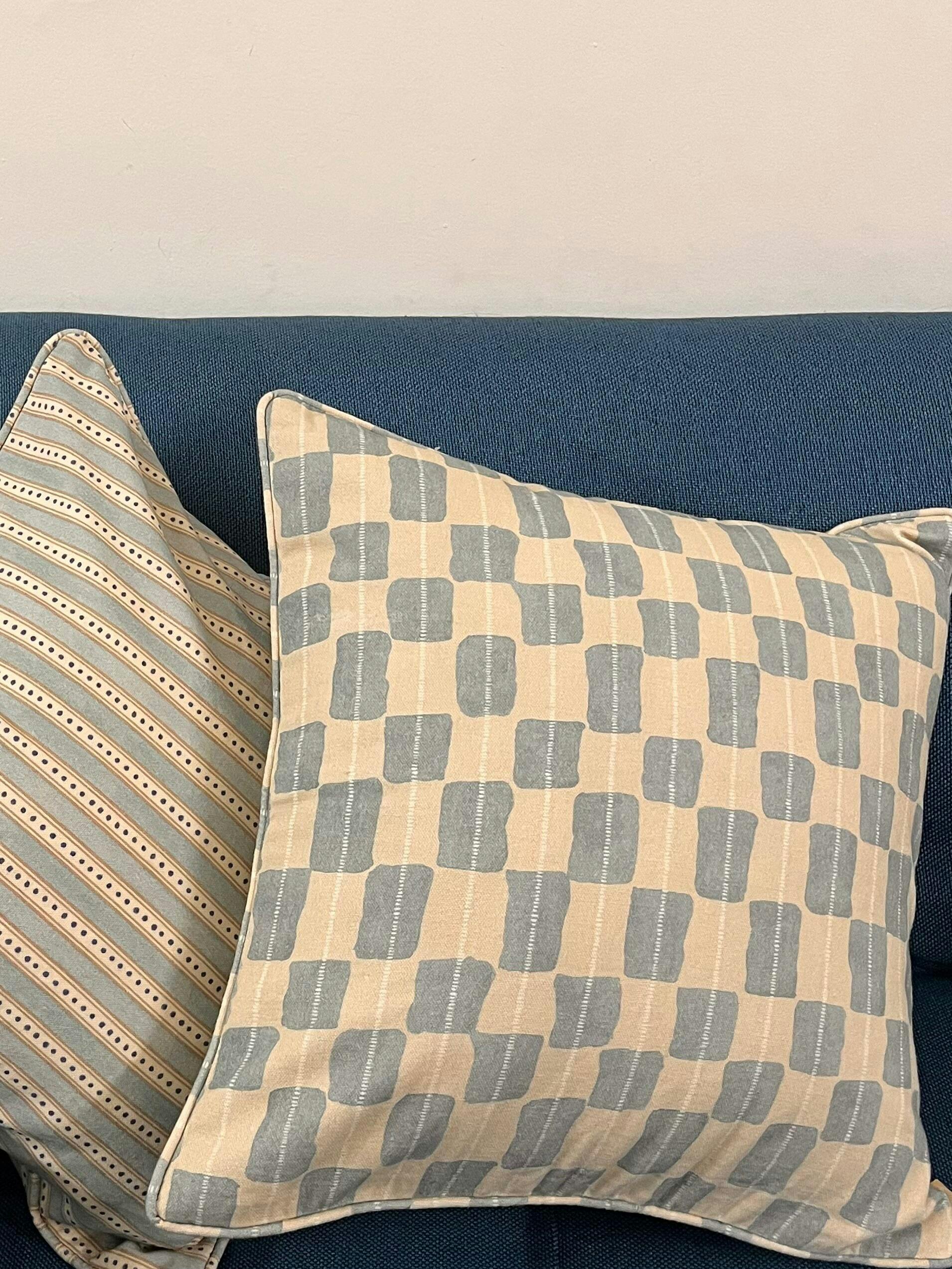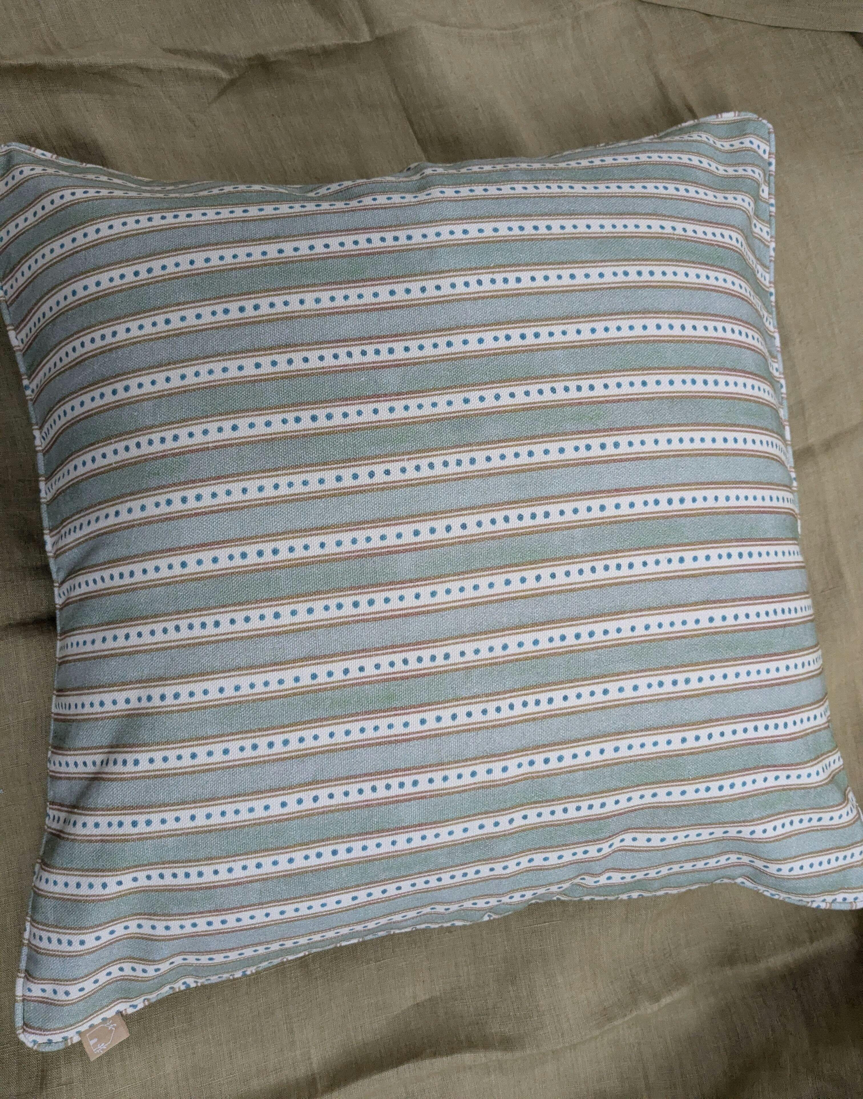 Our River Soft Blue Printed Cotton Cushion Cover features hand-painted vertical stripes by Ramita, printed on durable cotton duck fabric. Both front and back display the soft blue stripe pattern, finished with matching fabric piping for a refined look.