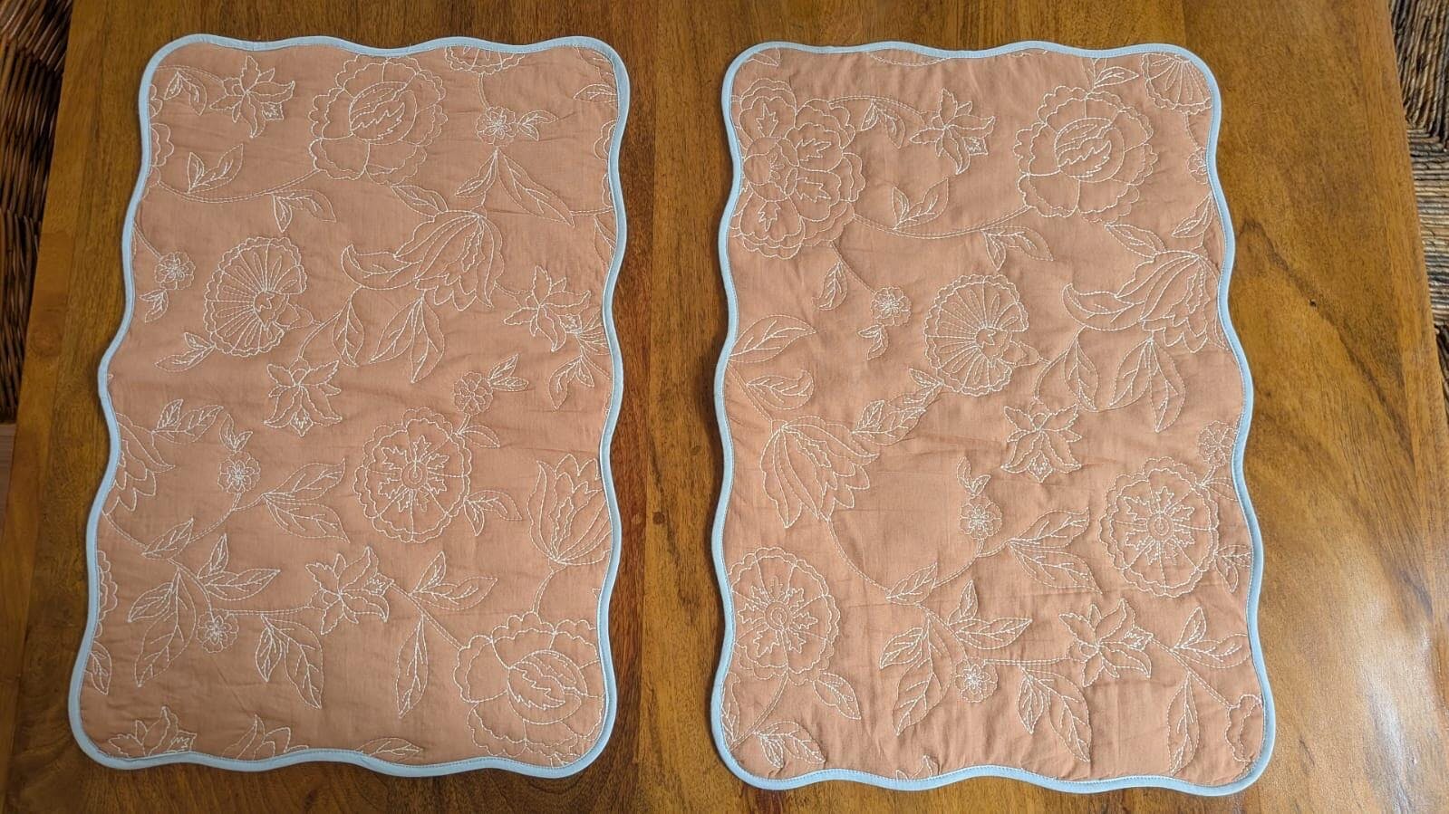 Our Rosabelle Chintz Scallop Mats brings timeless floral embroidery to the softness of cotton voile. Inspired by vintage chintz wall hangings from the 18th century, each motif is created with fine embroidery and lightly padded with polyfill to give it a soft, raised texture. The result is a rich surface that feels elegant, detailed, and inviting. The scalloped edges are framed with contrast piping, adding a gentle structure and hint of colour to each piece.