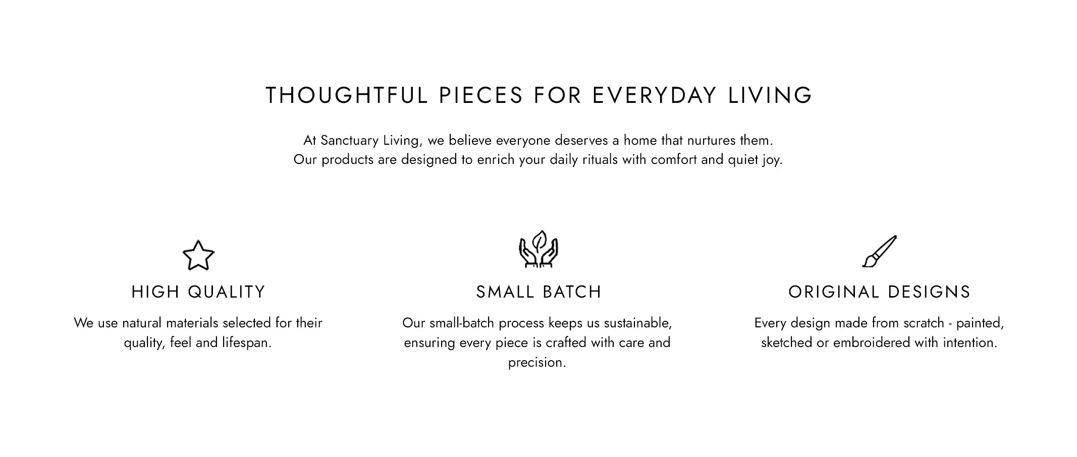 Inspired by the idea of our home as our sanctuary, we make products that bring a sense of calm into your home, making it a comforting space to thrive in. Featuring soft colours and nature inspired patterns, Sanctuary Living creates functional, elegant and timeless pieces that are used everyday and last a lifetime.